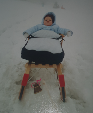 Als ich zum ersten Mal einen Wintereinbruch erlebte, ging es sofort zur ersten Schlittelfahrt. Vor war ein Glökchen befestigt... als ob ich eine Gefahr für andere Pistenteilnehmer wäre.