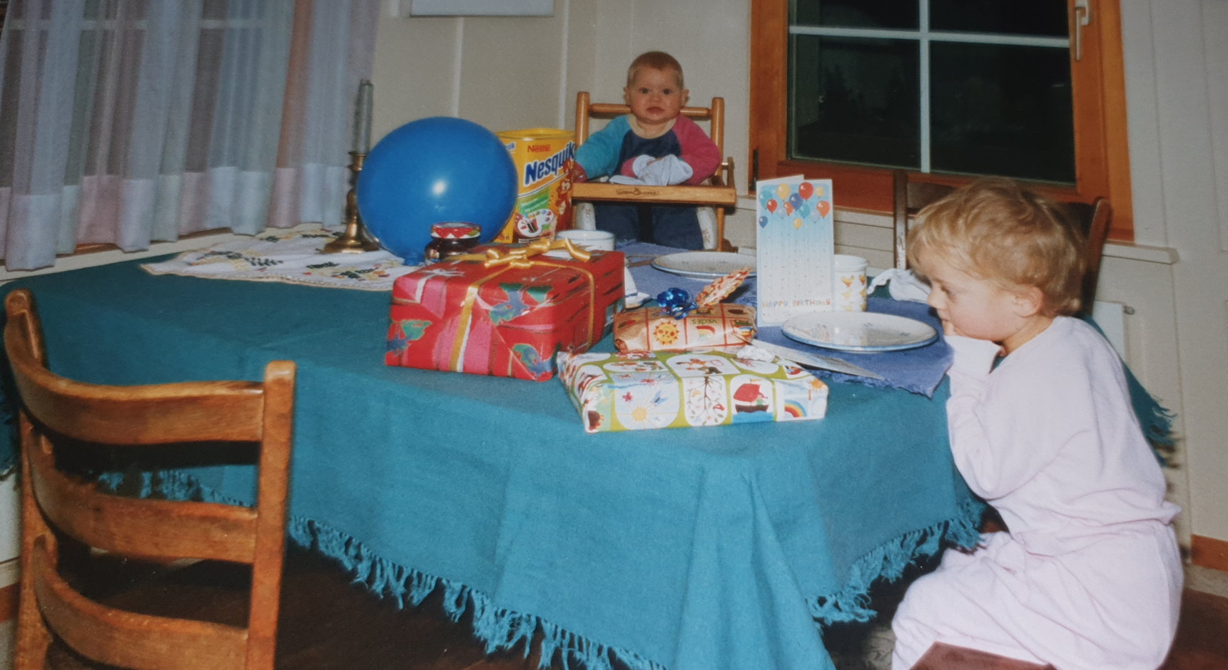 Ich feierte meinen dritten Geburtstag. Das erste Mal durfte meine Schwester beim Auspacken meiner Geschenke zuschauen.