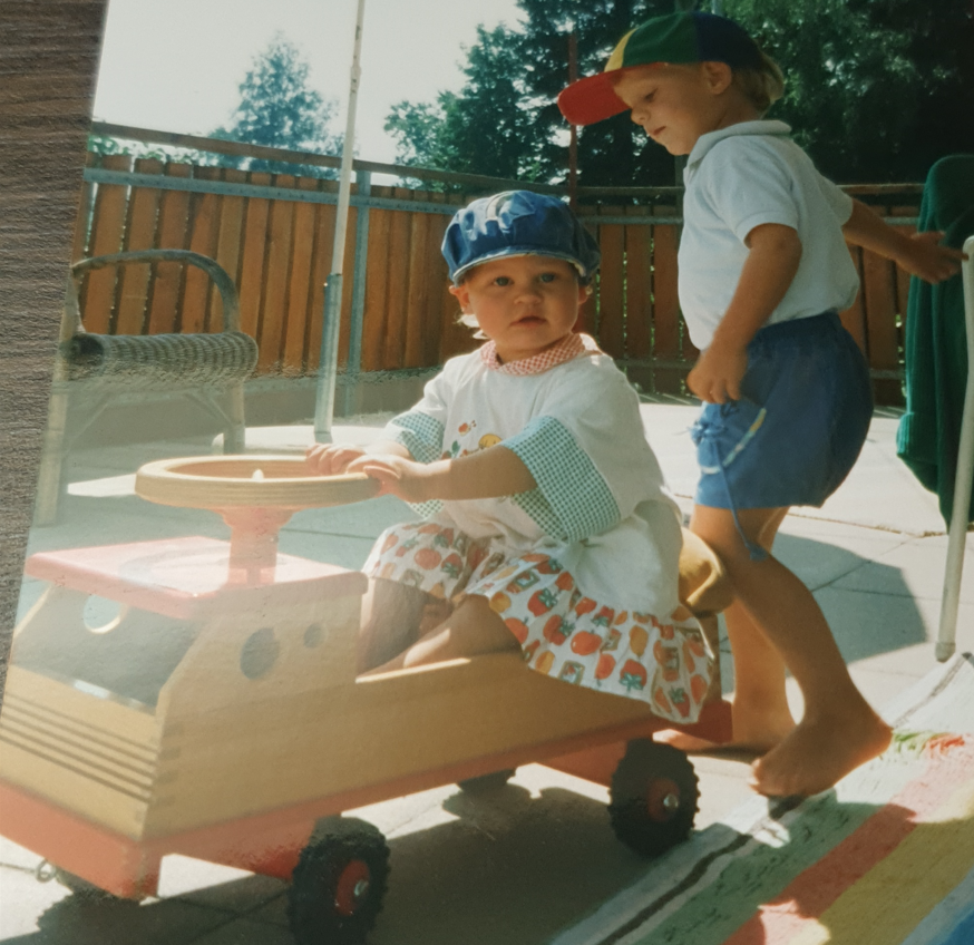 Wir hatten eine grosse Terasse wo wir spielen konnten. Hier mit einem Holz-Lastwagen, den meine Schwester fuhr. Ich wollte sie hier nicht, wie es evtl. aussieht, vom LKW runterkicken, sondern eher helfen Gas zu geben.