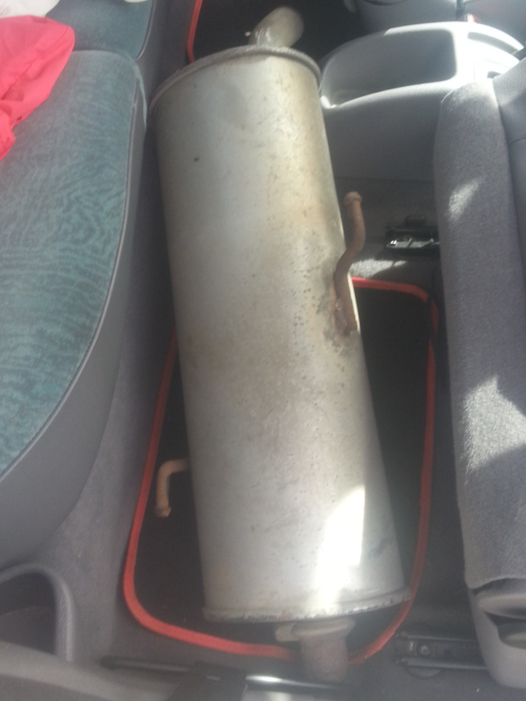 Wie abgeschnitten war nur noch eine Kiesstr... Steinstrasse eher, da die Steine faustgross waren. Ich fuhr seeehr langsam dieser Strasse entlang unter ständiger Angst, dass gleich ein Reifen platzen würde und mit der Hoffnung, dass doch bald besser Verhältnisse kommen würden. Als das Navi einen Trampelpfad über eine Wiese mir als die nächste Strasse vorschlug, wusste ich, dass darauf kein Verlass mehr ist. Ich fihr weiter gerade aus... "Kehren Sie wenn möglich um!" Und dann auf Höhe Ungrej... BAMM! ... war es so weit. Ich hielt an, stieg sofort aus und lief ums Auto herum. Erleichtert stellte ich fest, dass alle Reifen noch ganz waren. Wäre hier im Niemandsland, wo es nur Ruinen gab, ziemlich aufgeschmissen gewesen. Was ich entdeckte, war dass das Auspuffsrohr durchgebrochen war, und dieser nun von der Halterung herunterfiel. Ich wartete bis es ein bisschen abkühlte und hängte ihn wieder auf und fuhr weiter. Ein paar Minuten später: BAMM! Ich wartete wieder, bis er abkühlte, nahm den Auspuff dann ab und warf ihn auf den Rücksitz. Nun war guter Rat teuer.