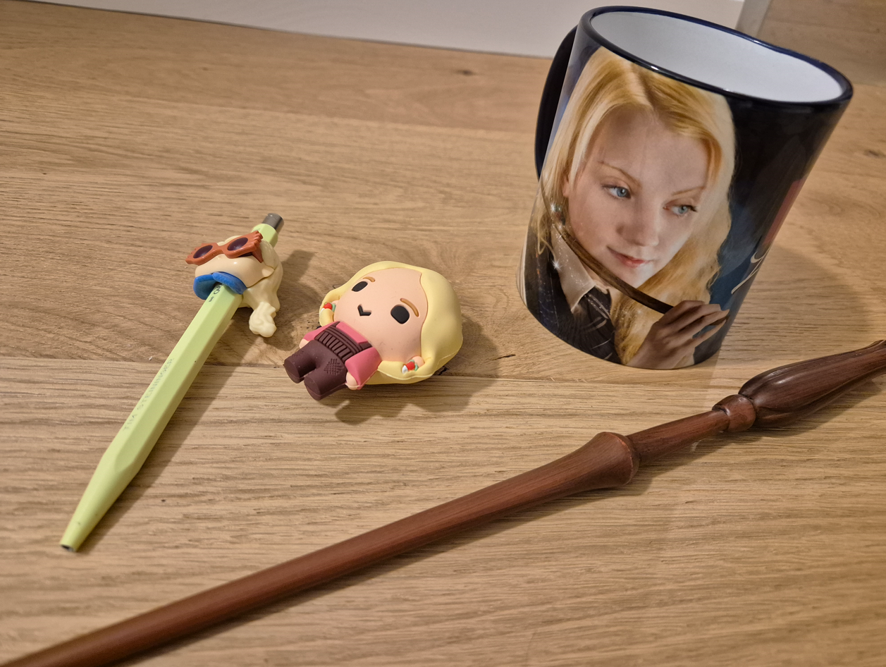 Als ich in München auf Shoppingtour war und in den Elbenwald ging, sah ich Harry Potter-Zauberstäbe. Ich schaute mir alle an und war mir nicht sicher, welchen ich kaufen möchte. Dann dachte ich wieder daran, dass ich mich bereits mal für Luna ausgesprochen habe und kaufte ihren Zauberstab.
