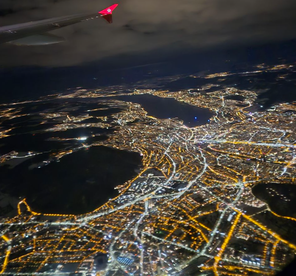 Pünktlich eingetroffen, gab ich mein Handgepäck auf. Da der Flug fast ausgebucht war wurde dies kostenlos angeboten. Als Dank erhielt ich einen Gutschein für ein Getränk an Bord. Jedoch war der Flug so kurz, dass ich dafür keine Zeit hatte. Bei der Sicherheitskontrolle war nicht eine einzige Person vor mir und ich konnte einfach sofort durch. Entsprechend unvorbereit war ich dann auch, da ich normalerweise in der Warteschlange Zeit habe, um alles für das Ablegen vorzubereiten. Danach ging es zum Gate B39, wo ich um 18:25 Uhr in die Edelweiss-A320 HB-JLS einstieg. Diese flog heute bereits nach Teneriffa und zurück. Auf dem Fensterplatz 33F gemütlich gemacht, verliess der Flug LX1076 10min verspätet das Gate und hob um 19:10 Uhr ab. Es war eine hervorrande Aussicht auf die in Lichter gehüllte Schweiz. Der Zürichsee und auch den Bodensee waren klar als dunkle Flecken zu erkennen.