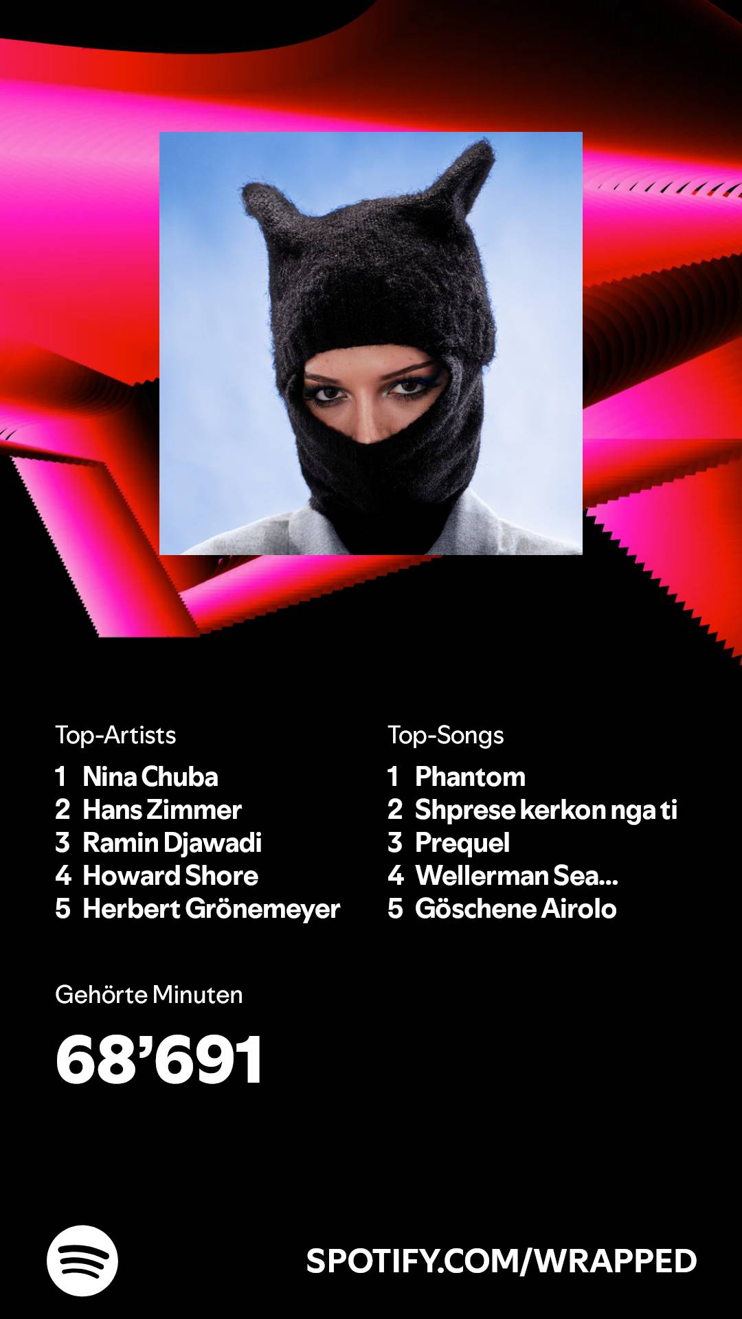 Von 2242 verschiedenen Artist habe ich Musik gehört. Doch die, die es meinen Ohren am meisten angetan hat ist Nina Chuba. 8 Tage lang war mein längster Streak, doch höre ich sie immer wieder, unter anderem zum Haushalt machen. Auch half sie mir zur emotionaler Ruhe, was ich vor allem im Oktober nötig hatte. Knappe 33h habe ich nur ihre Musik gehört und gehöre somit zu den Top 0.1% der Fans. Neben den drei bereits erwähnten Lieblings Soundtrack-Komponisten, welche Platz 2-4 einnehmen, hörte ich auch viel Herbert Grönemeyer. Er und Ramin Djawadi sind bereits seit 3 Jahren in Folge in meinen Top 5.